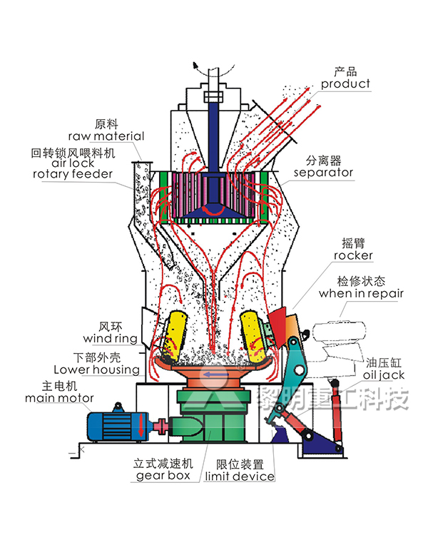 由熱風(fēng)爐出來(lái)的熱風(fēng)或廢氣,在系統(tǒng)風(fēng)機(jī)的抽引下,進(jìn)入立式磨煤機(jī),與磨內(nèi)被粉磨的原煤進(jìn)行充分熱交換后,帶起煤粉在分離器處進(jìn)行分選,細(xì)度不合格的粗煤粉重新落到磨盤上進(jìn)行粉磨,合格的煤粉隨氣流進(jìn)入防爆氣箱脈沖收塵器被收集下來(lái),經(jīng)過(guò)分格輪卸入煤粉倉(cāng)。 原煤中的雜物,如部分煤矸石、金屬塊等,通過(guò)風(fēng)環(huán)、吐渣口排除磨外。