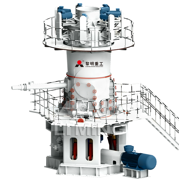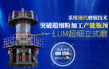 LUM超細立磨主要由電動機、減速機、磨輥裝置、磨盤裝置、加壓裝置、選粉機、機體和油站等組成。 主電機通過減速機帶動磨盤轉動,同時風從進風口進入磨機,物料經(jīng)螺旋給料機下料口落在磨盤中央,在離心力的作用下,物料從磨盤中央向邊緣均勻移動,經(jīng)過磨盤上的粉磨輥道區(qū)域時,受到磨輥的碾壓,大塊物料直接被壓碎,細粒物料受擠壓后形成料床進行粒間粉碎。被粉碎的物料繼續(xù)向磨盤邊緣移動,直到被風環(huán)處的強氣流帶走,而較大的顆粒物料又重新掉落到磨盤上繼續(xù)粉碎,氣流中的物料經(jīng)過上部的分離器時,在轉子葉片的作用下,粗顆粒重新回到磨盤上粉磨,合格的細粉隨氣流一起出磨,被系統(tǒng)的集粉器收集,被收集到的粉料即為超細立磨磨出的產品?;烊胛锪系蔫F塊等雜物隨物料運動到磨盤邊緣時,由于自身重量大而不能被風吹起,跌落至磨機下腔被安裝在磨盤底部的刮料板刮入排渣口排出機外。