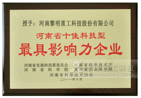 2011年度河南省十佳科技型企業(yè)(企業(yè)家)評選結(jié)果揭曉,黎明重工科技喜獲“河南省十佳科技型具影響力示范企業(yè)”榮譽稱號。