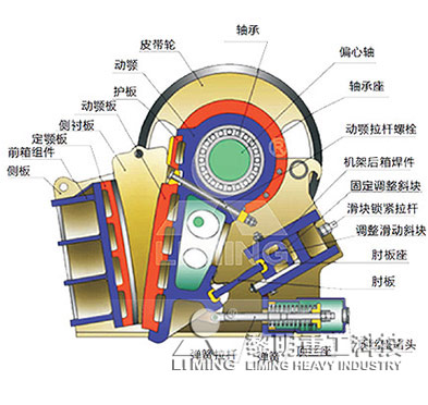 歐版顎式破碎機(jī)主要由機(jī)架部分,偏心軸轉(zhuǎn)動(dòng)部分,破碎腔工作部分,保險(xiǎn)裝置,排料口調(diào)整裝置等組成。