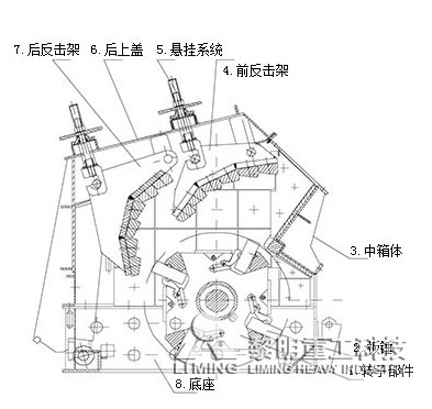 反擊式破碎機利用沖擊能來破碎物料。工作時,在電動機的帶動下,轉子高速旋轉,物料進入板錘作用區(qū)時,與轉子上的板錘撞擊破碎,后又被拋向反擊裝置上再次破碎,然后又從反擊襯板上彈回到板錘作用區(qū)重新破碎,此過程重復進行,物料由大到小進入一、二、三、反擊腔重復進行破碎,直到物料被破碎至所需粒度,由出料口排出。調(diào)整反擊架與轉子之間的間隙可達到改變物料出料粒度和物料形狀的目的。