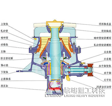 工作時,由電動機帶動水平軸旋轉,水平軸通過齒輪帶動偏心套旋轉,再由偏心套帶動動錐部做圓周擺動,從而實現連續(xù)的擠壓破碎石塊。