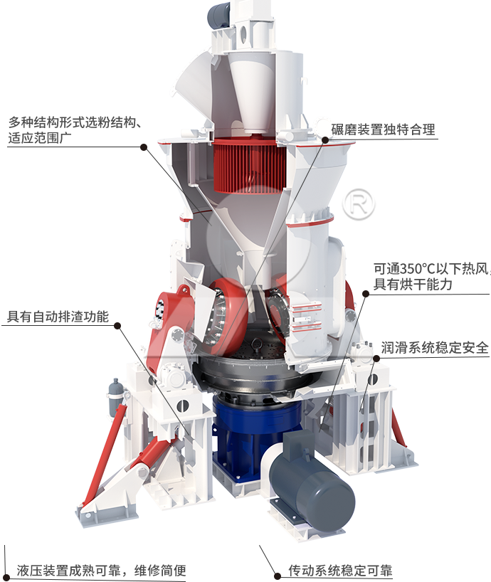 主電機通過減速機帶動磨盤轉(zhuǎn)動,同時熱風(fēng)從進風(fēng)口進入立磨機體內(nèi),物料從下料口落在磨盤中間,在離心力的作用下,物料從磨盤中間向邊緣均勻移動,經(jīng)過磨盤上的粉磨輥道區(qū)域時,受到磨輥的碾壓,大塊物料直接被壓碎,細(xì)粒物料受擠壓后形成料床進行粒間粉碎。被粉碎的物料繼續(xù)向磨盤邊緣移動,直到被風(fēng)環(huán)處的強氣流帶走,而較大的顆粒物料又重新掉落到磨盤上繼續(xù)粉碎,氣流中的物料經(jīng)過上部的分離器時,在轉(zhuǎn)子葉片的作用下,粗顆粒重新回到磨盤上粉磨,合格的細(xì)粉隨氣流一起出磨,被系統(tǒng)的脈沖除塵器收集,被收集到的粉料即為成品?;烊胛锪系蔫F塊等雜物隨物料運動到磨盤邊緣時,由于自身重量大而不能被風(fēng)吹起,跌落至磨機下腔被安裝在磨盤底部的刮料板刮入排渣口排出機外。